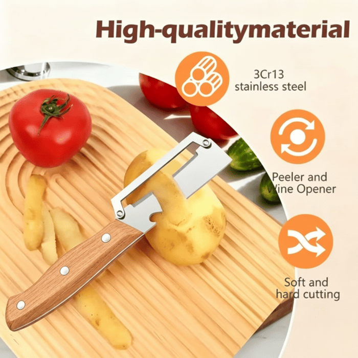 Hemat ruang dan waktu. Nikmati fungsi pisau tajam dan pengupas premium dalam satu alat berdesain eksklusif dan elegan.